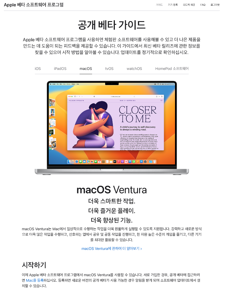 베타 버전 사용은 https://beta.apple.com/ 으로 들어가셔서, 애플 계정으로 로그인 한 후, macOS 탭에서 시작하기에 있는 "Mac을 등록"을 누르신 후, 제공되는 프로그램은 다운로드하여 설치하시면 평상시처럼 소프트웨어 업데이트 하시면 베타 버전 이용이 가능합니다.