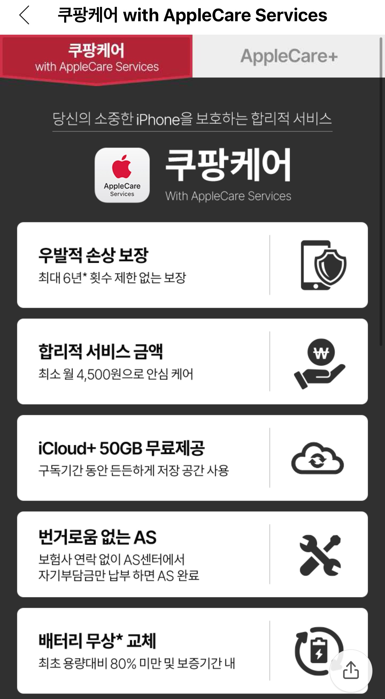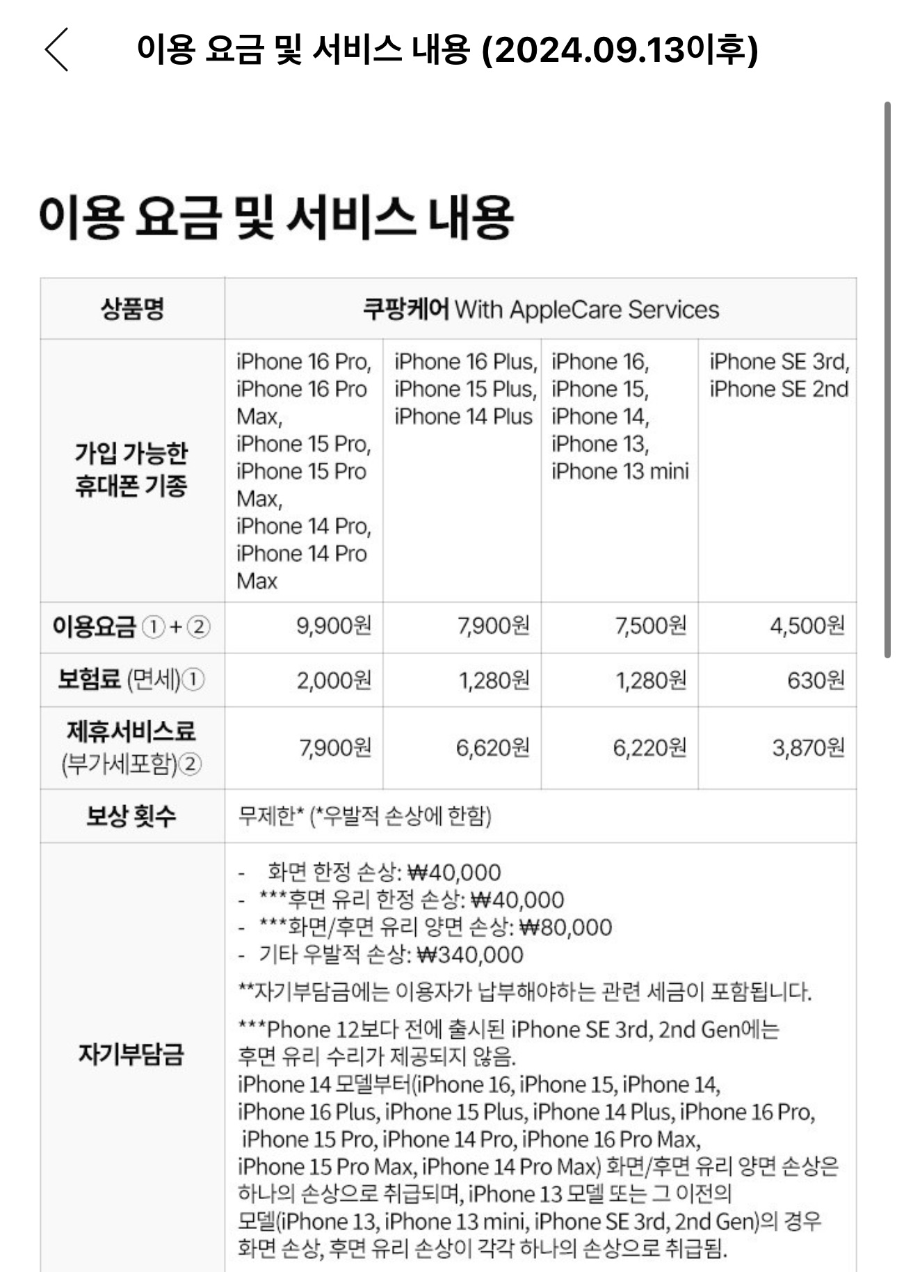 심지어 쿠팡케어로 애플케어서비스 가입이 매달 계속 지불한다면 6년까지 서비스 보장이 가능하고, 기존 애플케어플러스처럼 애플 서비스센터에서 서비스 받을 때 자기부담금만 내면 되는 방식이기에 굉장이 괜찮은 서비스가 출시되었다고 생각했죠. 그런데 최근 지인이 이 서비스를 가입하고 다른점이 있더라는 이야기를 듣고 확인해보니 가입전에 꼭 참고해야 할 만한 사항이 있었습니다.
