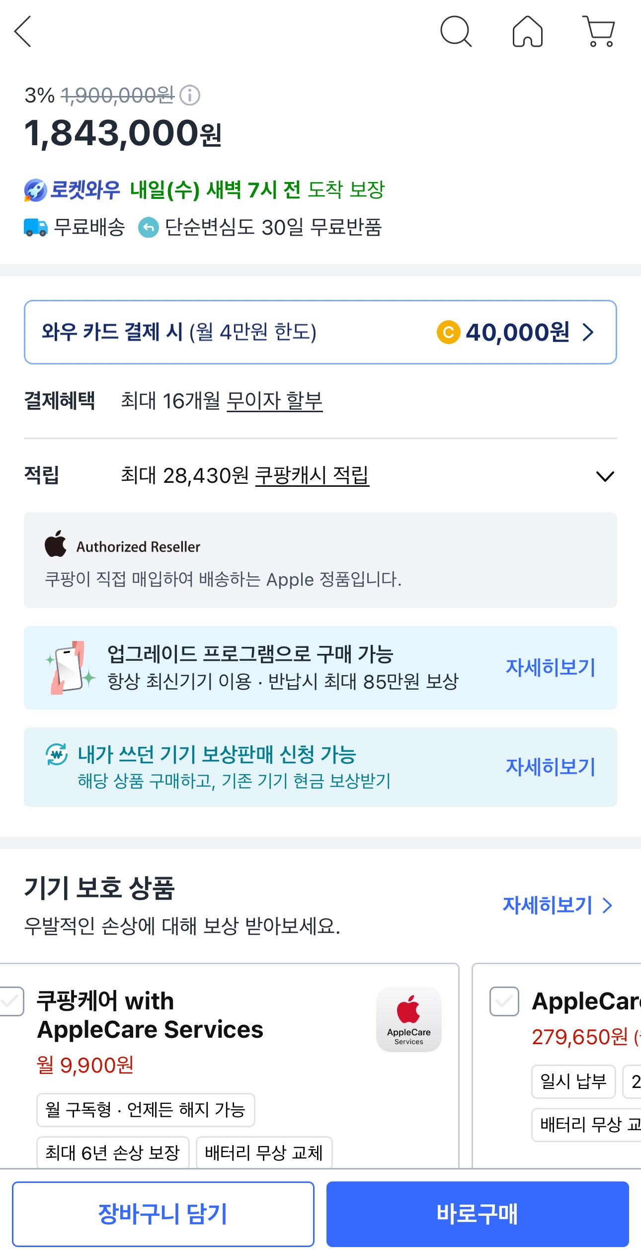 위의 사진에서 알 수 있는 것처럼 애플케어를 일시납하면 279,000원대인데, 매월 납부하면 9,900원이기 때문에 2년 보장을 기준으로 생각해보아도 쿠팡 애플케어가 저렴하고 월납하기 때문에 부담도 적다고 느꼈기 때문입니다.