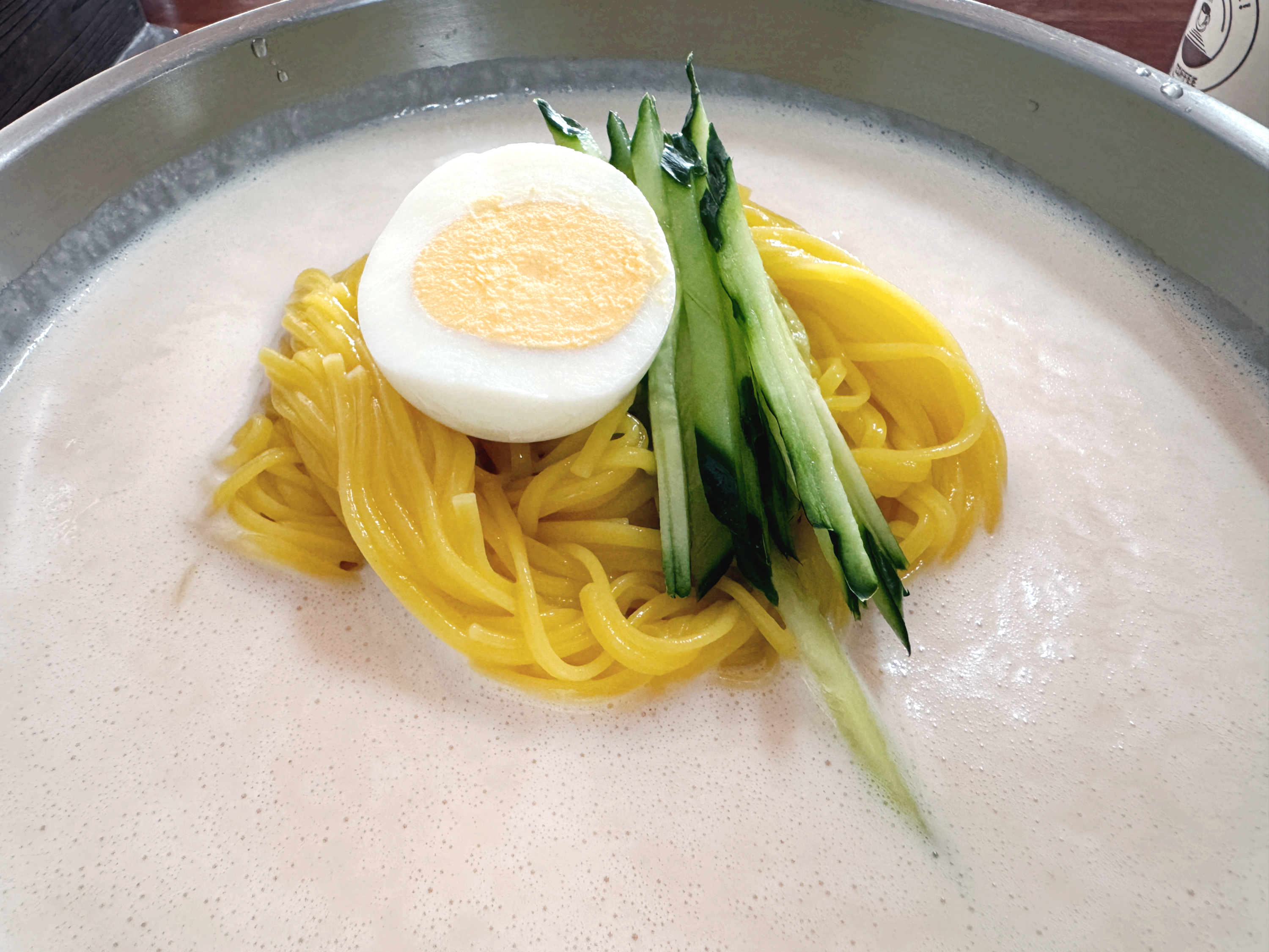 그리고 기다림 끝에 나온 콩국수. 크림처럼 부드러운 국물 위에 가지런히 놓인 노란 면발, 그 위에 싱그러운 오이채와 반숙 달걀 반쪽이 얹혀 있었습니다. 첫 한 숟갈을 입에 넣는 순간, 깊고 고소한 콩의 맛이 혀끝에서 퍼졌습니다.
